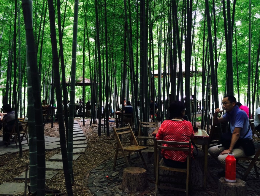 宝岩竹林四周密密麻麻的都是竹子,走进去一下子就凉了很多,顺着台阶往上走,慢慢地听见小溪流淌的声音,"叮咚叮咚",非常动听。竹林中有很多竹楼,在竹林中间喝茶永远是最惬意的。就这样坐着,和好友亲朋聊聊近况,谈谈未来。
